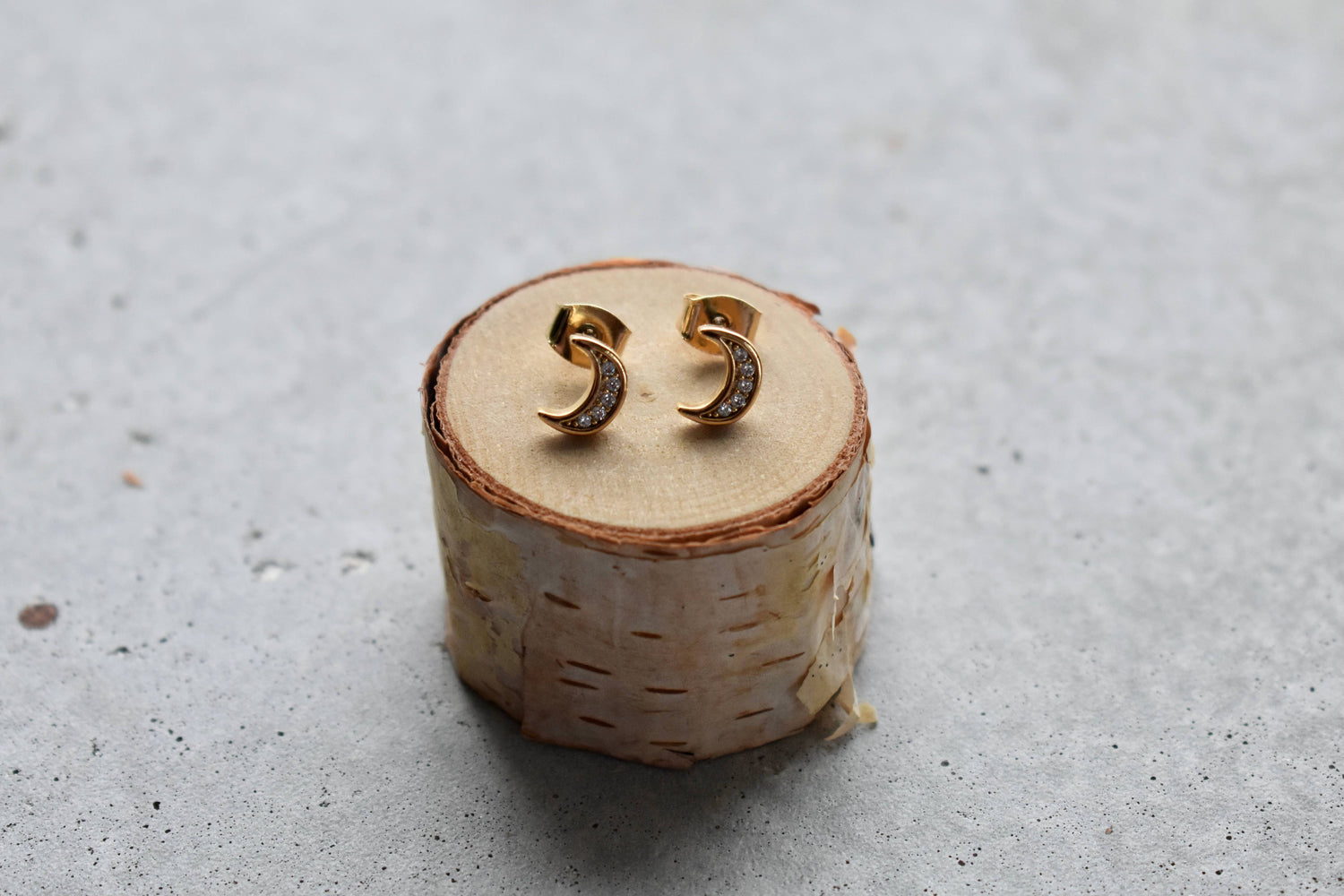 The Gold Crystal Moon Stud Earrings are cute and dainty everyday studs, featuring a sparkling cubic zirconia stone set in 16K gold plated brass. Each earring measures 8x3.3mm and includes a stainless steel post with a secure locking butterfly clutch. Designed with sensitive ears in mind, they are nickel and lead free for comfortable, all-day wear.