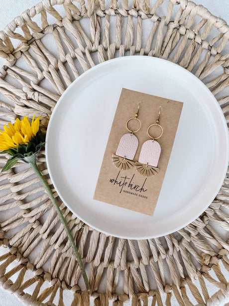 Beige Leather & Brass Sunburst Geometric Earrings: Raw Brass Hooks