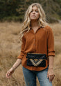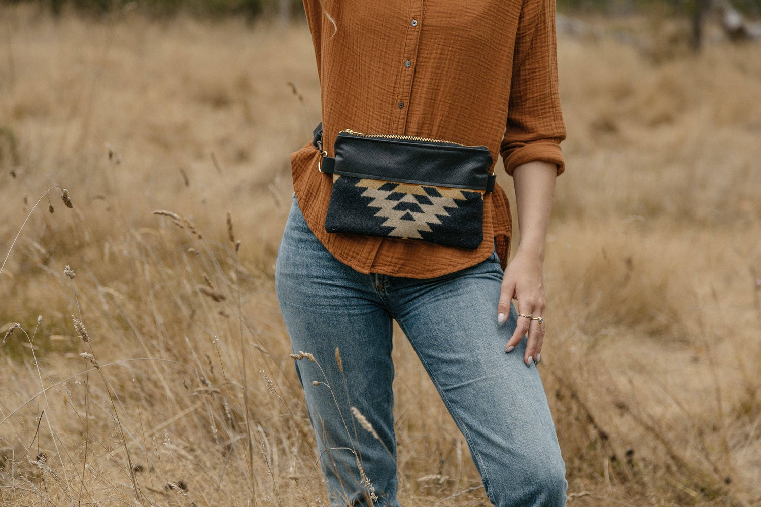 Elevate your style with our handcrafted leather belt bag, featuring authentic Pendleton wool in the iconic Rancho Arroyo print. Meticulously made in Canada, this modern take on the classic fanny pack blends artisan craftsmanship with everyday function, making it a perfect choice for travel, festivals, or daily errands. Designed with a solid leather backing, adjustable leather belt with brass hardware, and a brass zipper with leather pull, it offers both durability and timeless appeal. The interior is lined with natural off-white canvas and sized just right at 10 inches wide by 7 inches tall to carry your essentials with ease. A must-have boho-chic statement piece, this belt bag is sure to resonate with fashion-forward customers looking for hands-free convenience without sacrificing style—ideal for curating a standout spring and summer boutique collection.