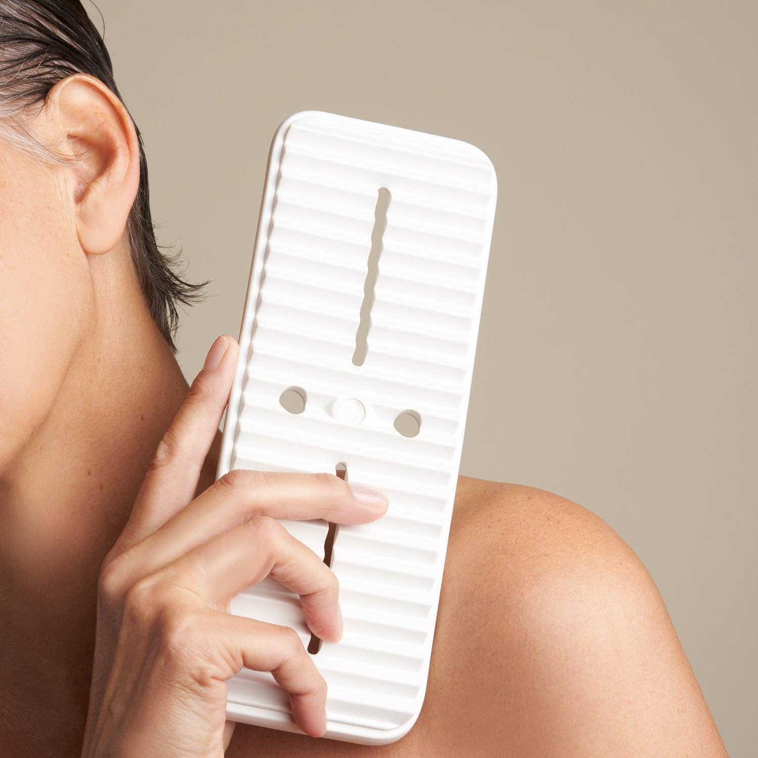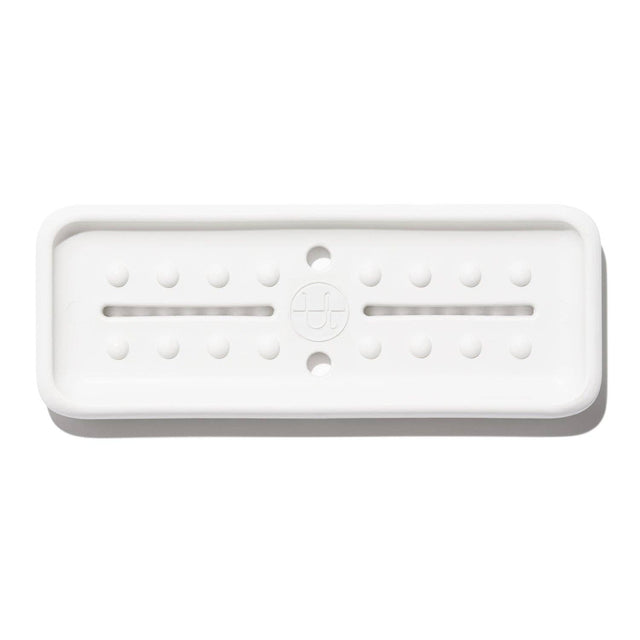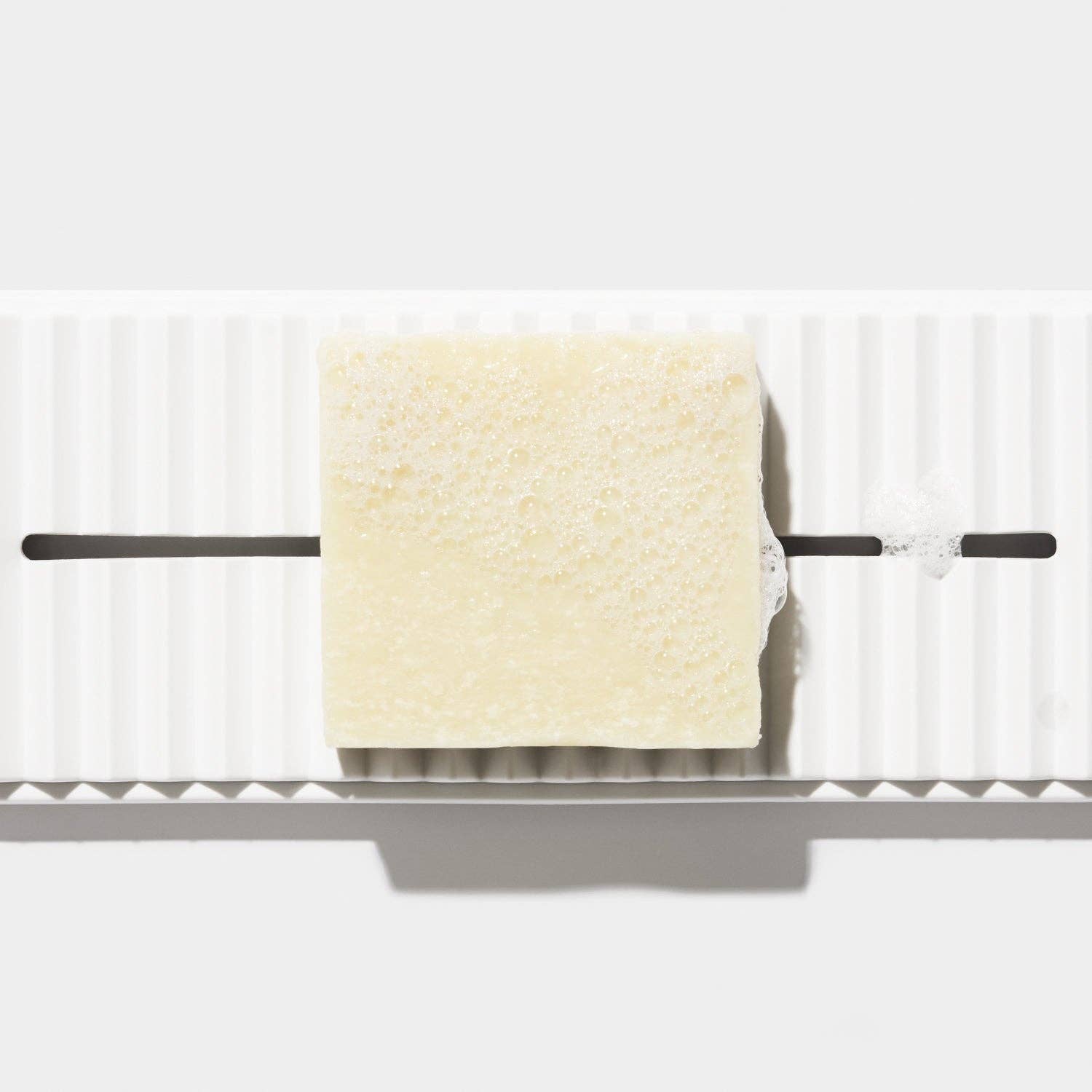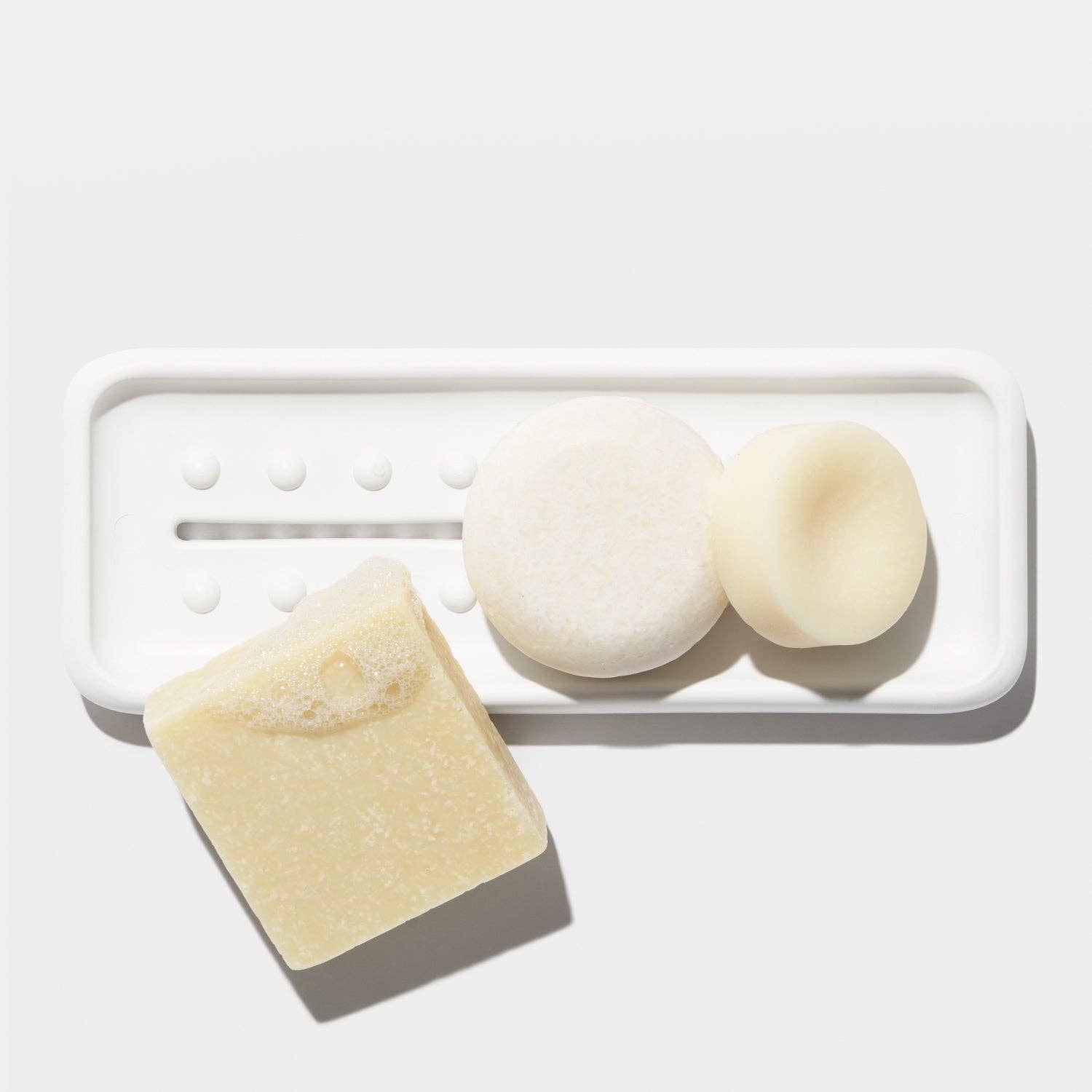 Perfect for your shower shelf, vanity or counter top, our soft and flexible silicone bar tray lets water drain, and air flow freely, allowing your shampoo, conditioner, and bar soap, to dry completely (and extend their life!). The logo side can be used comfortably for a set of hair bars plus a body bar, while the ridged side is ideal for use as the bars get smaller (for more drainage) and for 5+ bars; hair and body!