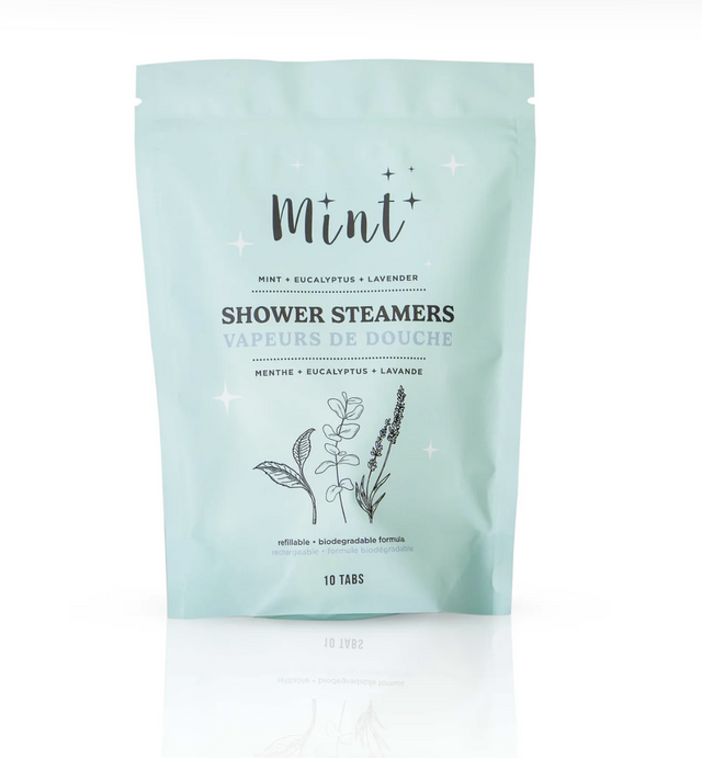 Transform your shower experience with Mint’s invigorating Shower Steamers, infused with pure essential oils of mint, eucalyptus, and lavender. Each steamer slowly releases aromatic, soothing vapours, perfect for refreshing your senses and easing congestion during cold and flu season.  This set includes 10 handmade steamers, crafted with 100% natural ingredients to bring an at-home spa experience to your shower.