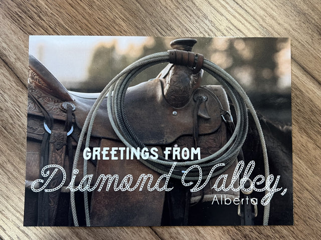 Capture the rugged spirit of Alberta’s western heritage with our Diamond Valley postcard, featuring a beautifully detailed photo of a classic saddle. This postcard evokes the timeless feel of cowboy culture and the open range, making it perfect for sharing a thoughtful message or adding to your collection. Printed on high-quality cardstock, it’s a meaningful keepsake that celebrates the essence of Diamond Valley and the province’s proud ranching roots.