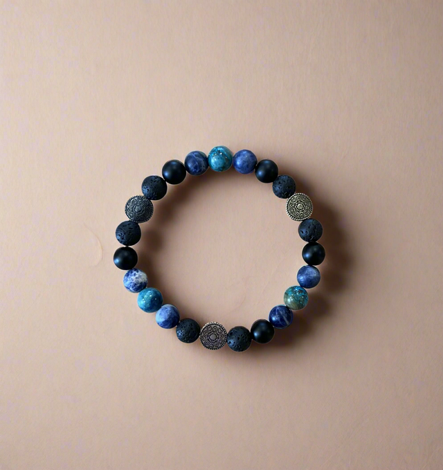 Grounding lava stone brings strength and stability, while chrysocolla encourages calm communication and inner balance. Heart-opening sodalite adds clarity and peace of mind. Together, they embody renewal, emotional harmony, and the healing rhythm of moving water. A reflection of quiet trails and mindful moments, this bracelet is made for those who seek peace and wisdom in nature’s simple beauty.