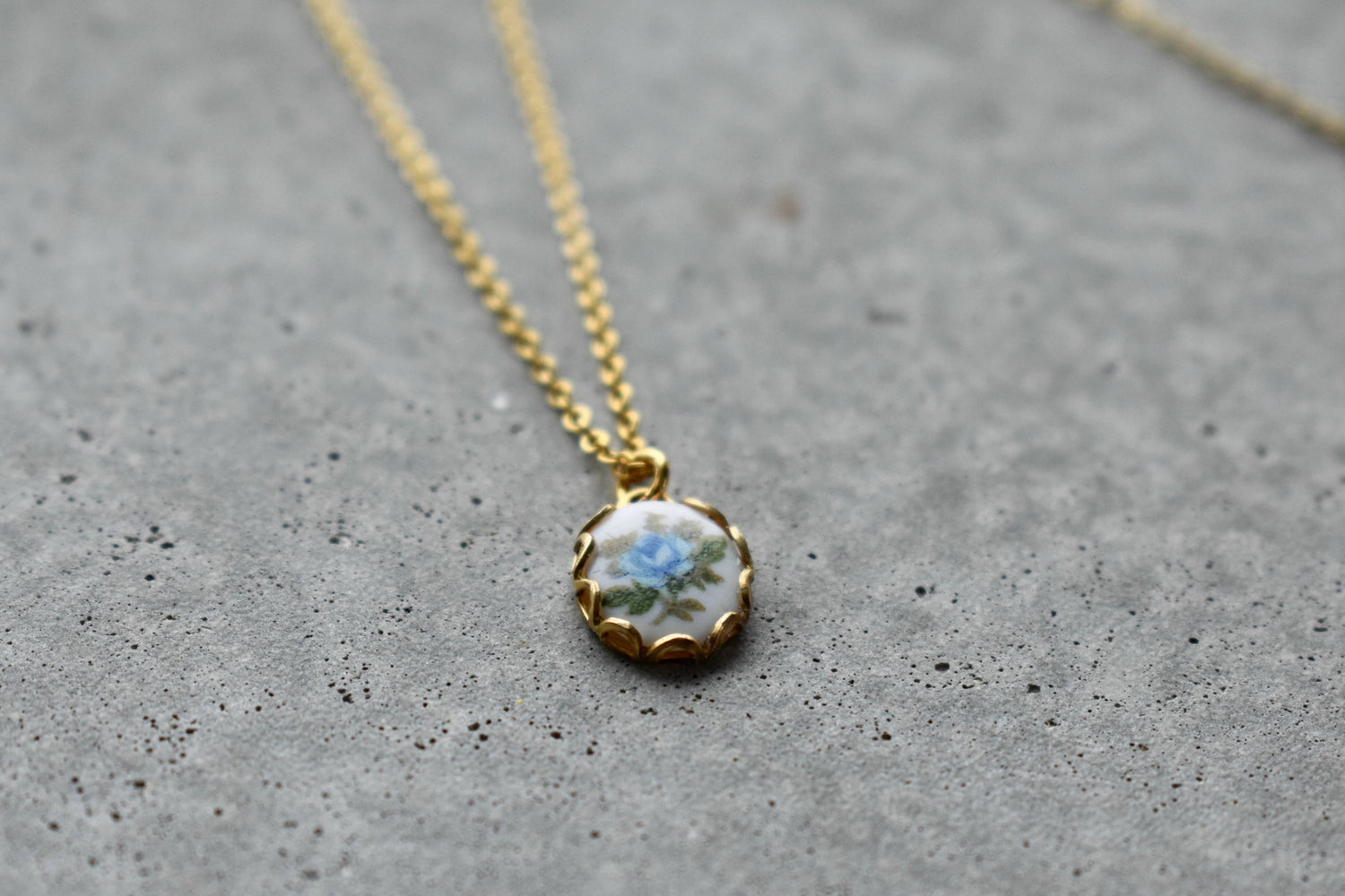 The Vintage Floral Necklace – Blue Rose features a real vintage porcelain pendant from the 1960s, offering a sweet touch of nostalgia. The delicate yellow rose pendant measures 10x8mm and hangs on a 16-inch 16K gold plated brass chain with a 2-inch extender for adjustable length. All parts are nickel and lead free, making it safe for sensitive skin. To keep it looking its best, avoid getting it wet.