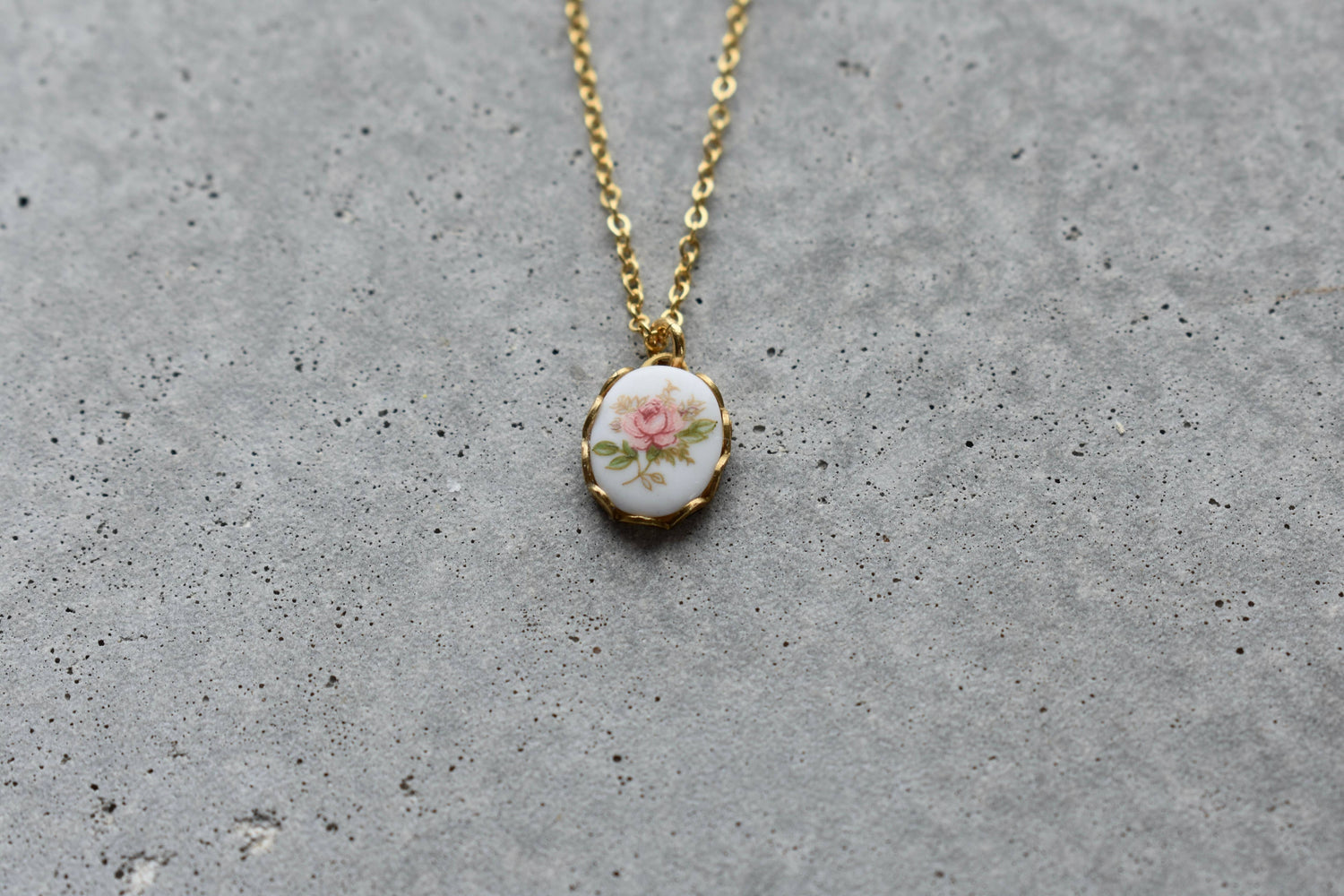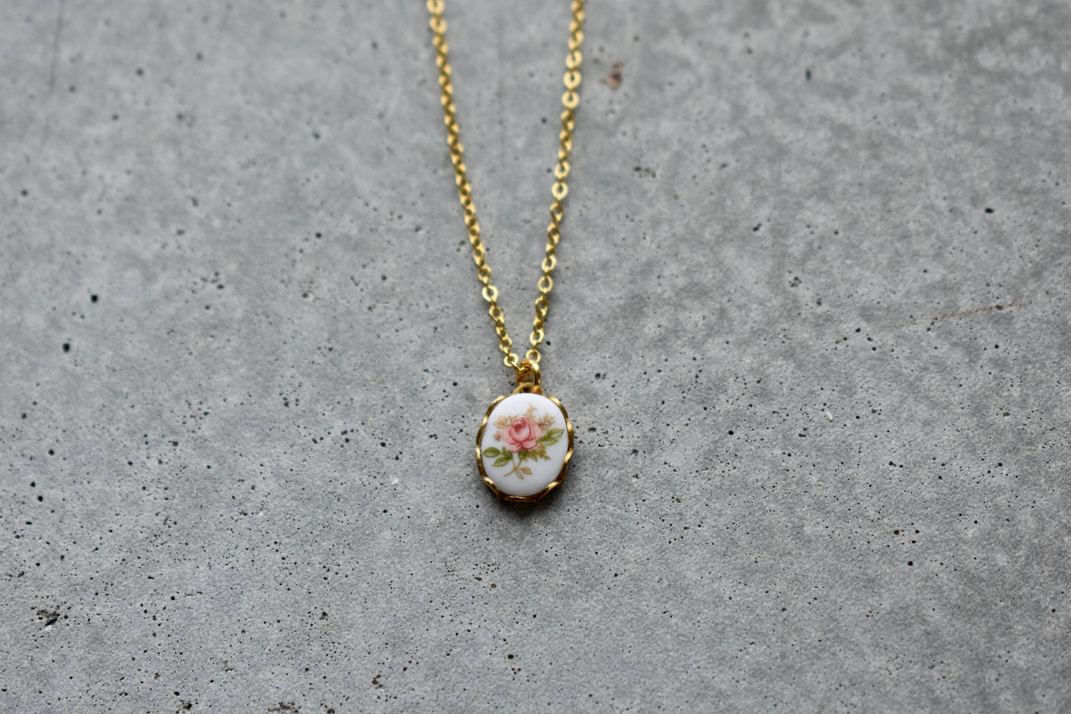 These cute necklaces feature real vintage porcelain pendants from the 1960's. The chain is made from 16K gold plated brass The pendant measures 10x8mm and comes on a 16” chain with 2” extender. All parts are nickel and lead free. Avoid getting wet.