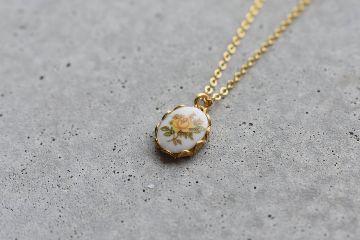 The Vintage Floral Necklace – Yellow Rose features a real vintage porcelain pendant from the 1960s, offering a sweet touch of nostalgia. The delicate yellow rose pendant measures 10x8mm and hangs on a 16-inch 16K gold plated brass chain with a 2-inch extender for adjustable length. All parts are nickel and lead free, making it safe for sensitive skin. To keep it looking its best, avoid getting it wet.