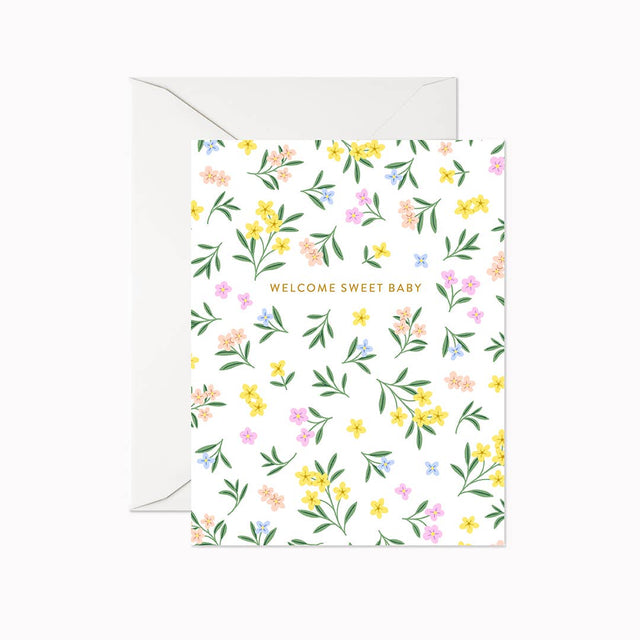 Celebrate the arrival of a precious little one with our charming baby greeting card, adorned with a light and delicate floral pattern.
