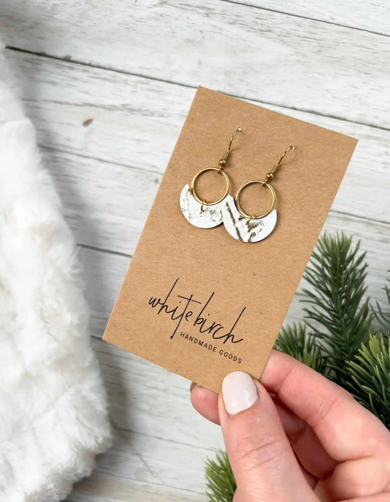 Elevate your look with these elegant White and Gold Fleck Leather Small Crescent & Brass Ring Earrings. Featuring raw brass ear wires and accents, each pair combines soft shimmer with bold structure for a unique, modern style. Over time, the raw brass will naturally oxidize, developing a beautiful vintage-like patina that adds character and charm to your earrings.